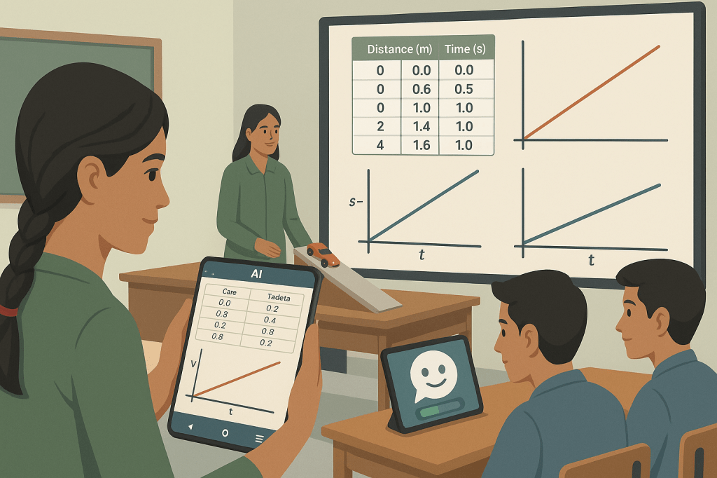 উপকরণ: ছোট খেলনা গাড়ি/গোলক, কার্ডবোর্ড/প্লাস্টিক ঢাল, রুলার/টেপ, স্টপওয়াচ/মোবাইল ভিডিও, “AI গ্রাফিং/ডেটা-এক্সট্র্যাক্টর” (যে-কোনো) ও স্প্রেডশিট।