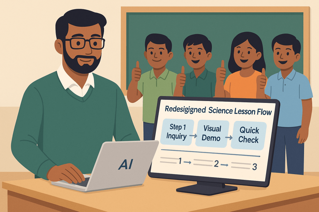 ২) AI-কে বলুন: “একই লেসনকে ৩ ধাপে সাজাও: (i) ছোট অনুসন্ধান, (ii) ভিজ্যুয়াল/সিম, (iii) কুইক-চেক।”